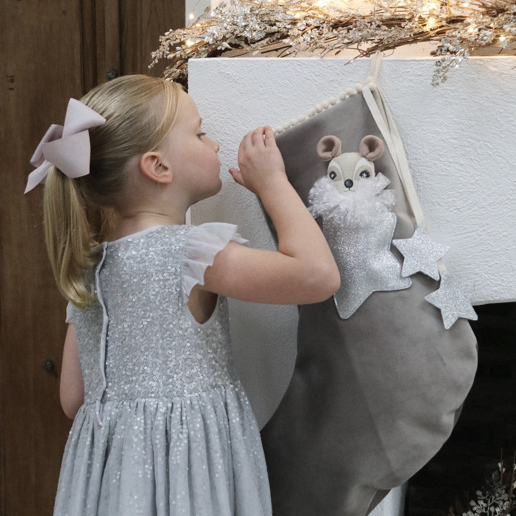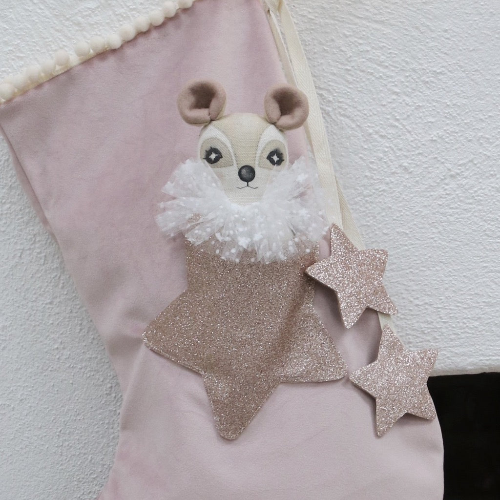 Super soft velvet is lined with natural cotton with a loop for easy hanging. Mini pom poms decorate the top and a felt lined glitter star pouch holds a mini Thicket & Thimble doll of your choice. Two hanging star charms complete the stocking.
